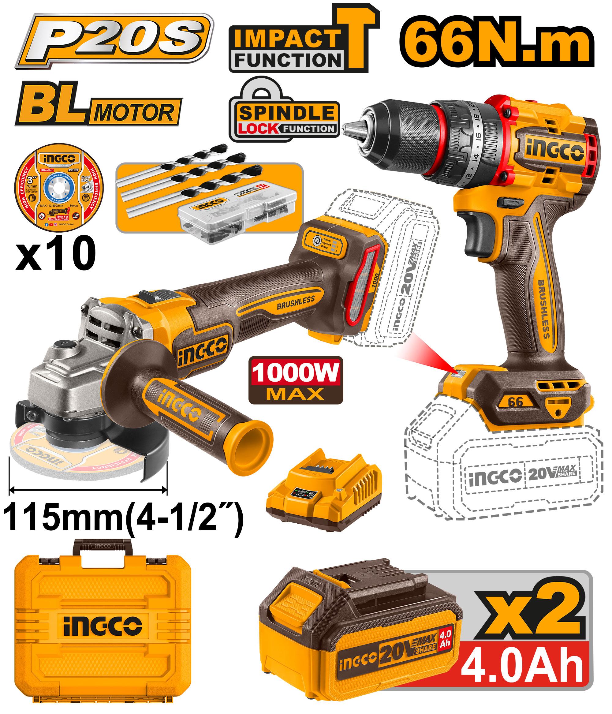 KIT DE TALADRO INALAMBIRCO BRUSHLESS + ESMERILADORA INALAMBRICA BRUSHLESS 20V INGCO UCKLI20273